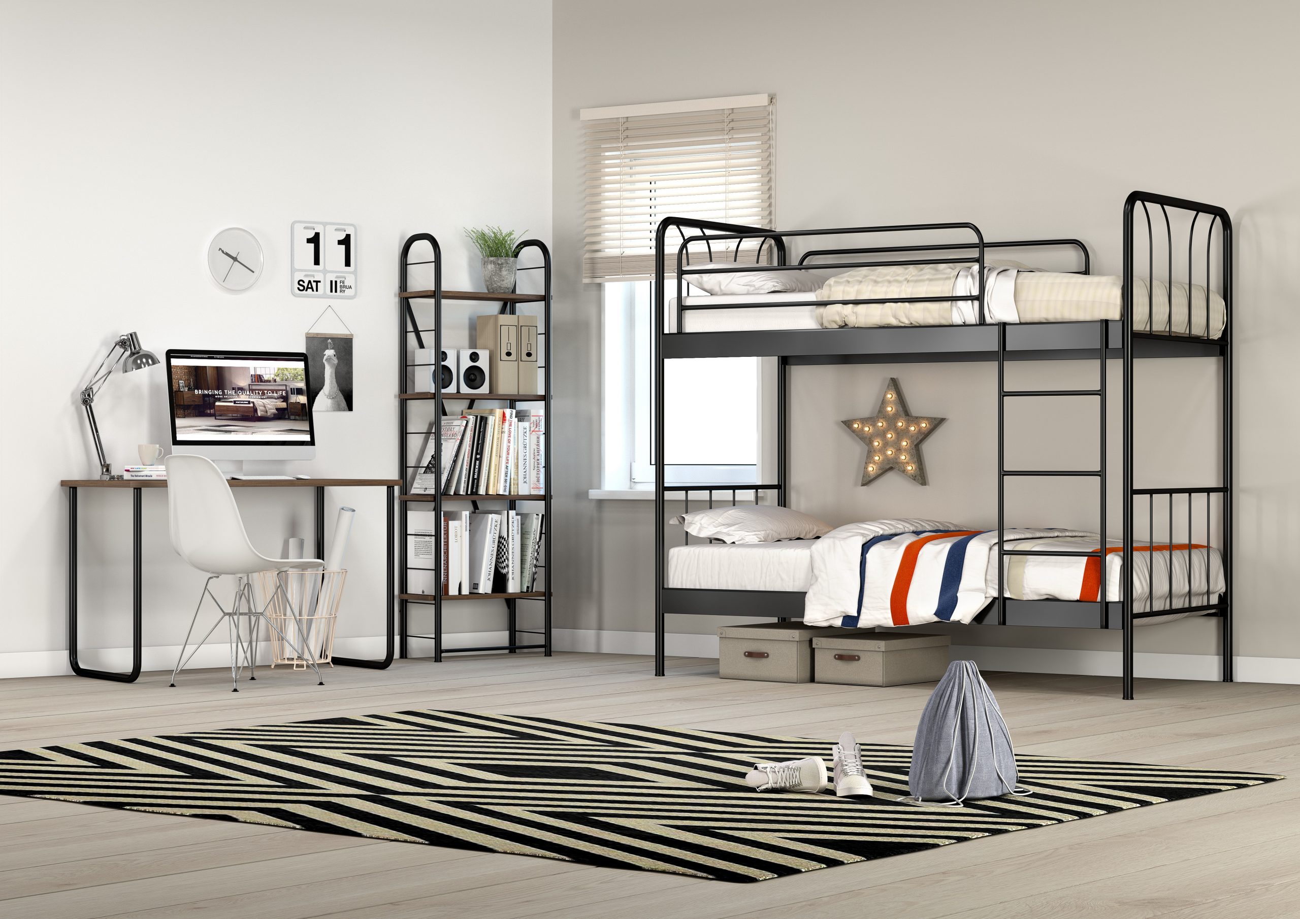 Σετ υπνοδωματίου αποτελούμενο από μεταλλικά κουκέτα, γραφείο και βιβλιοθήκη.